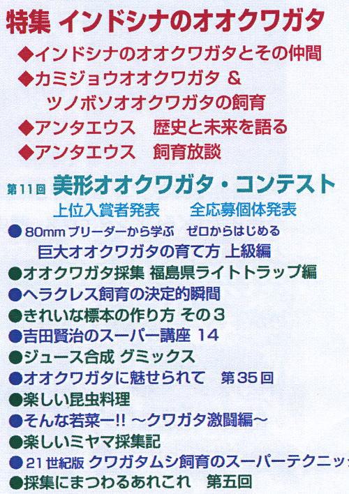 今回の号はひさびさにオオクワガタを取り扱った、 「インドシナのオオクワガタ大特集!!」です。 “インドシナの”という冠が付いていますが、このインドシナ周辺だけでもアンタエウスを筆頭に、グランディス、ホペイ、クルビデンス、パリー、カミジョウ、ツノボソなど複数の大型オオクワガタが集中しており、まさにオオクワガタの中心地。 これらの大型オオクワガタに加え、スキットオオミントオオなどの小型オオクワガタから、アーチェルニセヒラタライヒヒラタなど、その状況がいまいちよくわかっていない種類も、「現状では一番詳しい!」と胸をはって言えるレベルの巻頭解説を実現しています。 巻頭解説とともに、ぜひ皆さんに読んでいただきたのは、アンタエウスブーム全盛期の頃の話を座談会形式でおくる「アンタエウス歴史と未来を語る」と、90mmオーバーという、とてつもないサイズのアンタエウスを育てるにはどうしたら良いかを緊急取材してきた「アンタエウス飼育放談」の2本。 昔のアンタエウスがいったいどんな扱いだったのか?! 90mm以上を羽化させるには、今までの常識は通用しないのか?!とにかく必見です。 巻頭特集以外にも、恒例の「美形オオクワガタ・コンテスト」、「ゼロから始める巨大オオクワガタの飼育法」などの人気記事以外に、前号で話題沸騰! 今回はいったいどんな食材が選ばれたのか、ひそかに大ブームになりつつある、「楽しい昆虫料理」の第2弾、ちまたで噂の「昆虫グミ」など、多彩な内容をひっさげてお送りいたします。 【出版社からのコメントより】